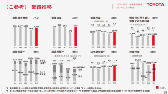 ただし、営業収益は30兆円と横ばい、営業利益は25000億円と過去最大を予定しております。これは売れる車種がより大型化したことに伴って、1台当たりの価格と利益が向上していることが起因しております。またコロナ渦で推し進めた原価低減がさらに効いてきており、過去最高の営業利益を達成する見込みです。
